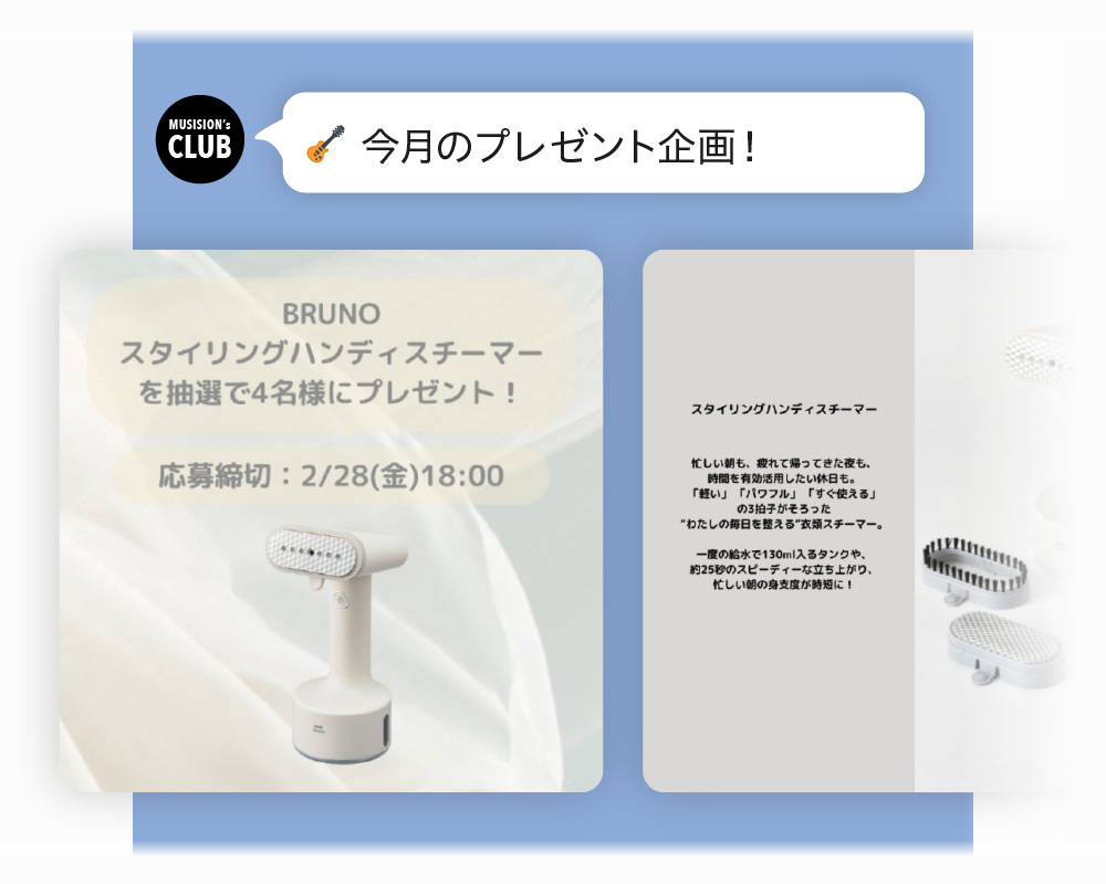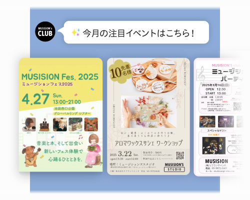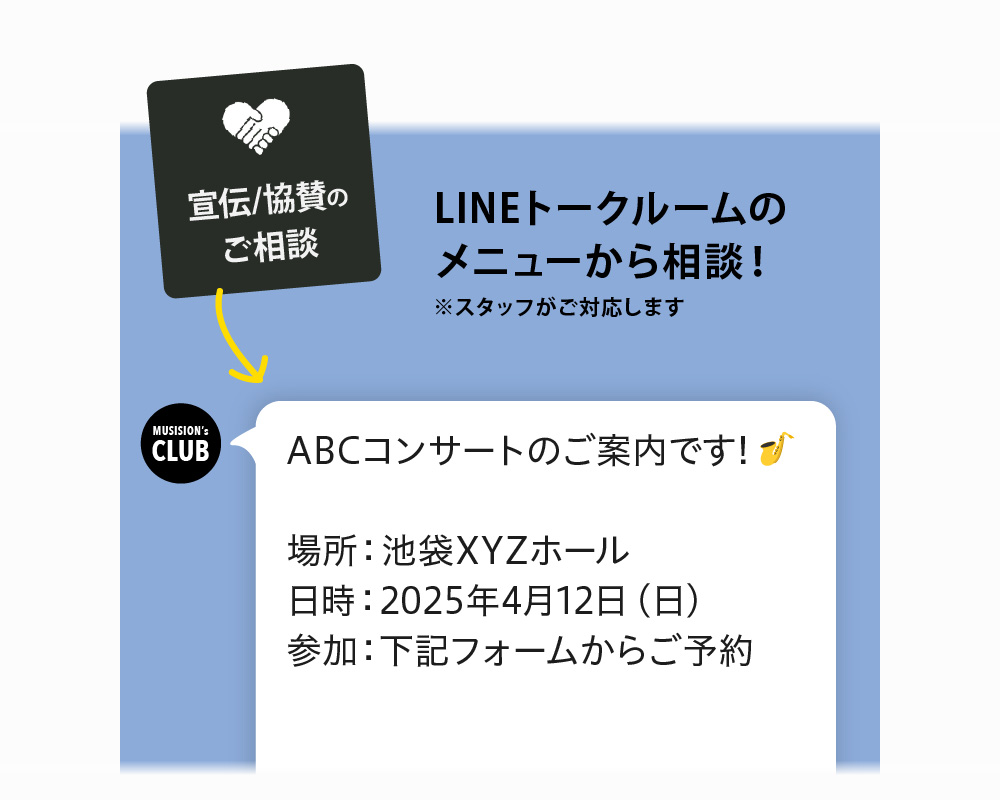 コンサート情報など、あなたの音楽活動をミュージションズクラブが応援!公式LINEで情報を配信できます。(※情報の内容は弊社にて確認します。ご希望に添えない場合がございます。)