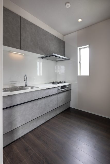 • キッチンは、3口コンログリル付きを使用。マグネット対応キッチンパネルを設置。キャビネットも多数あり、収納も充実しています。