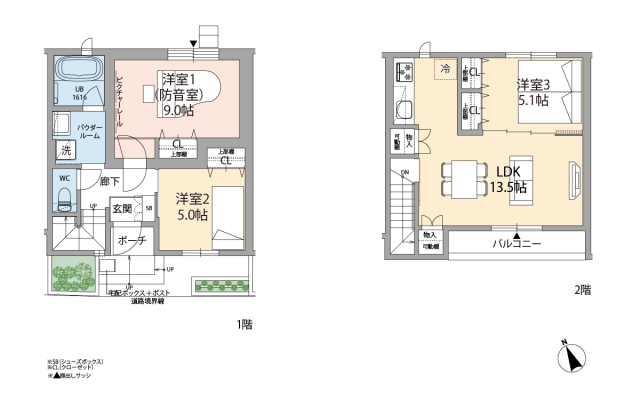 • 1階:洋室1(防音室)9.0帖、洋室2  5.0帖